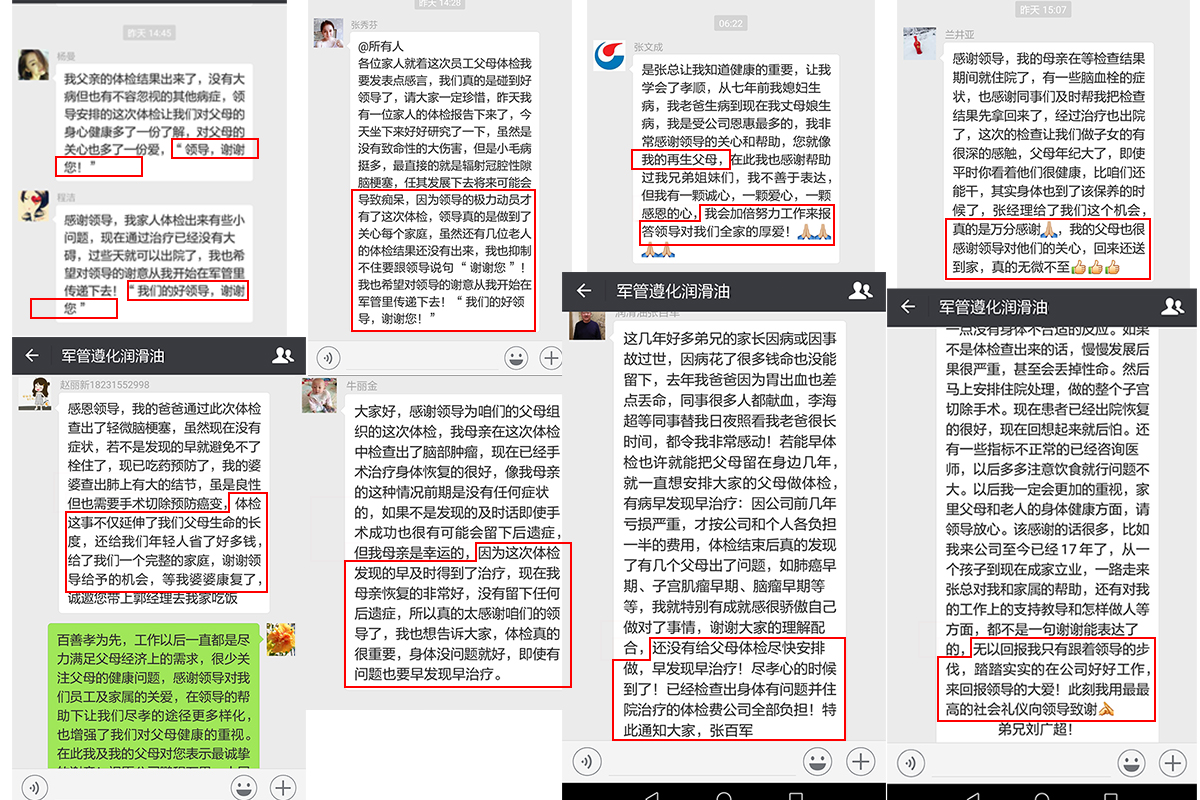 自從2018年相關(guān)數(shù)據(jù)顯示公司已經(jīng)扭轉(zhuǎn)連續(xù)多年虧損的狀態(tài),總經(jīng)理張百軍首先想到的是——公司員工的健康問(wèn)題,于2018年3月組織全體員工體檢,對(duì)于體檢張百軍總經(jīng)理要求不能敷衍了事,要針對(duì)全體員工的情況,制定相應(yīng)的體檢項(xiàng)目,幾經(jīng)周折最終選定在唐山人民醫(yī)院體檢中心做體檢工作。沒(méi)有想到員工的健康問(wèn)題只是張總關(guān)心的問(wèn)題之一,隨后張總召開(kāi)中層領(lǐng)導(dǎo)會(huì)議提出給員工父母體檢的想法,隨著時(shí)間的流逝,父母的年齡在不斷的增長(zhǎng),身體狀況也是每況愈下,但是他們對(duì)自我身體的健康意識(shí)卻非常的薄弱。于是接下來(lái)開(kāi)始動(dòng)員全體員工勸說(shuō)父母參加公司組織的體檢活動(dòng),又指定專人去各個(gè)醫(yī)院了解針對(duì)老年人的體檢項(xiàng)目,全體員工各司其職進(jìn)行著前期的籌備工作,于2018年8月完成了公司所有員工父母的體檢工作,所有員工父母對(duì)張總此次給予大家的福利深感謝意。其中多名員工的父母在這次體檢中受益匪淺,及時(shí)將病情扼殺在搖籃之中,為此多名員工表達(dá)了對(duì)張總的感謝。