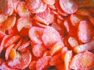 待胡蘿卜蜜餞冷卻至60℃時,拌上糖粉即成。