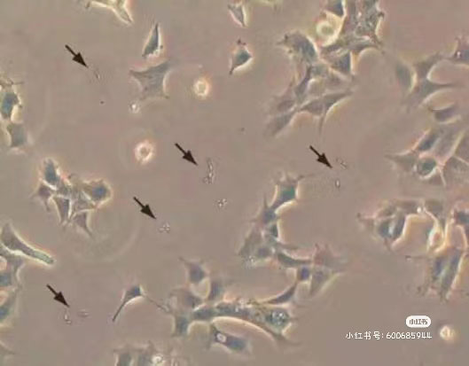 現(xiàn)象3:培養(yǎng)過程中細胞增殖突然變慢,培養(yǎng)基中黑點、碎片明顯增多,培養(yǎng)基PH變化(變黃)周期變短,那么細胞很可能已經(jīng)感染了支原體。