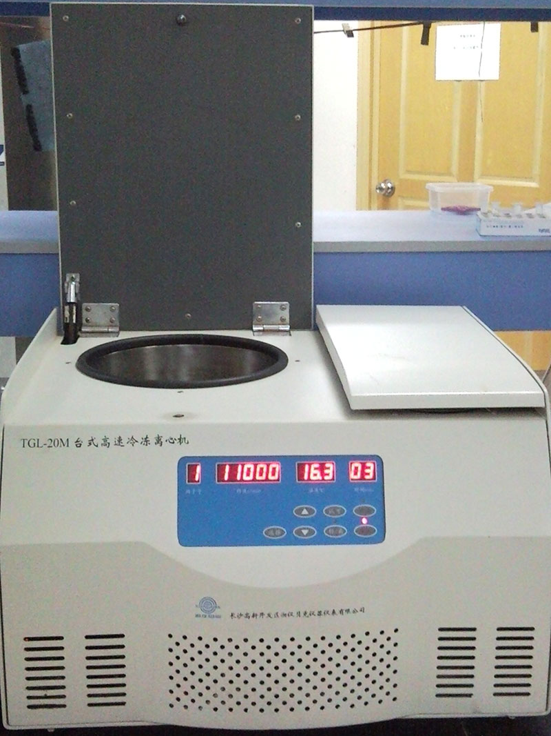 高速冷凍離心機(jī)型號(hào)為T(mén)GL-20M,最高轉(zhuǎn)速20000/min,最大離心力27810Xg,轉(zhuǎn)子數(shù)12個(gè)。